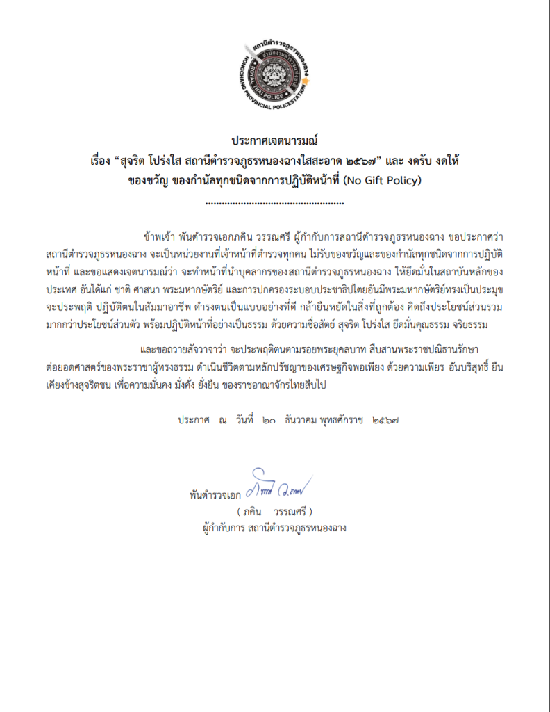 เรื่อง “สุจริต โปร่งใส สถานีตำรวจภูธรหนองฉางใสสะอาด 2567” และ งดรับ งดให้ ของขวัญ ของกำนัลทุกชนิดจากการปฏิบัติหน้าที่ (No Gift Policy)