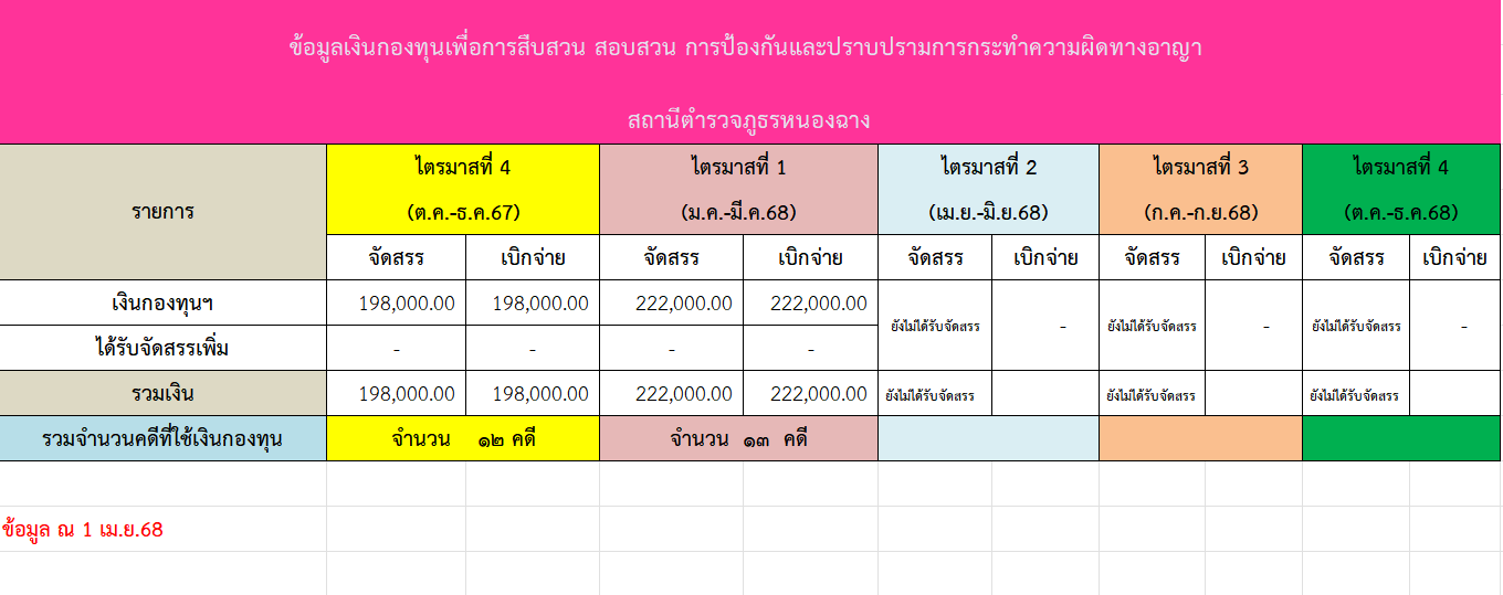 ข้อมูลเงินกองทุนเพื่อการสืบสวน สอบสวน การป้องกันและปราบปรามการกระทำผิดทางอาญา ที่สถานีตำรวจภูธรหนองฉางได้รับจัดสรร และการใช้จ่ายเงินกองทุน (ไตรมาสที่ 4 ปีงบประมาณ พ.ศ.2567 และ ไตรมาสที่ 1 ปีงบประมาณ พ.ศ.2568)