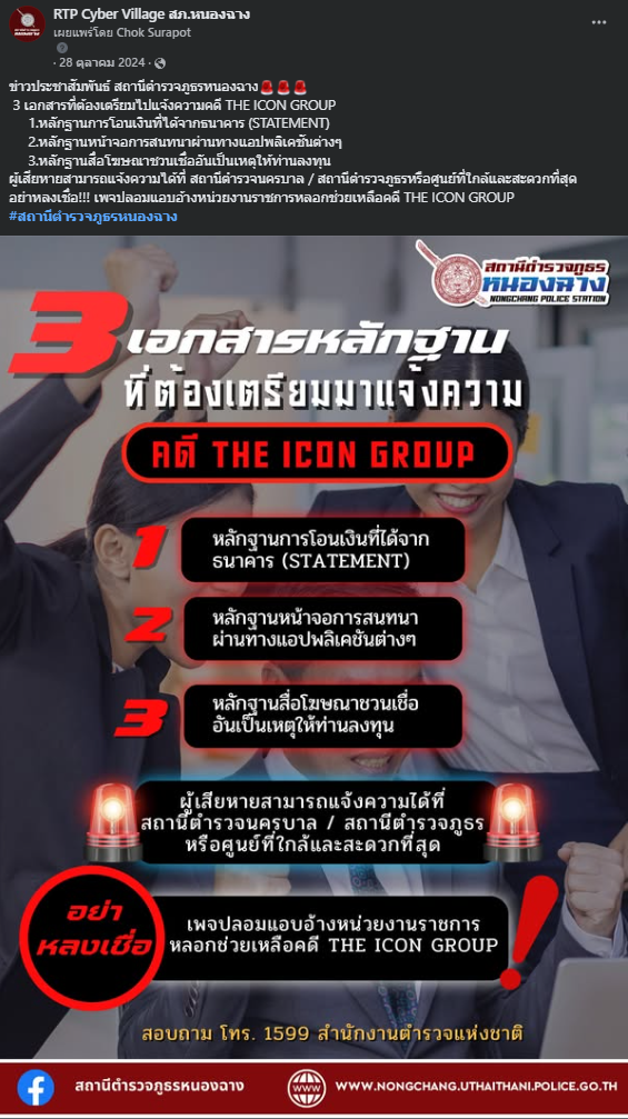ข่าวประชาสัมพันธ์ สถานีตำรวจภูธรหนองฉาง 3 เอกสารที่ต้องเตรียมไปแจ้งความคดี THE ICON GROUP 1.หลักฐานก